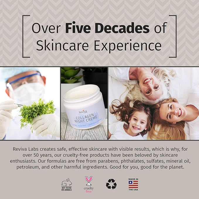 - For over 50 years, Reviva has pioneered functional skincare with products that deliver results. Our Collagen Night Cream is designed to deeply hydrate and support skin elasticity, all in a gentle, comforting formula suitable for most skin types.