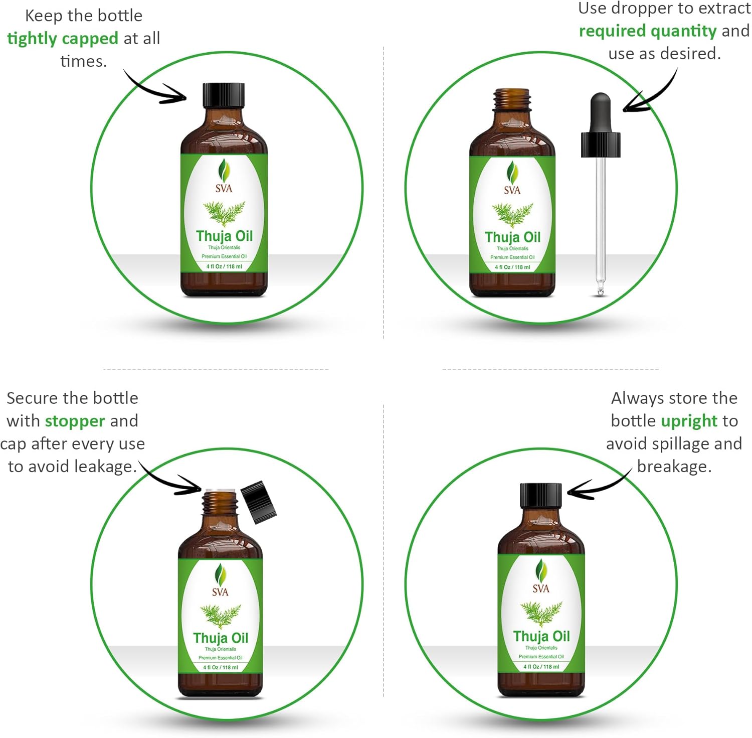 - HOW TO USE: SVA Thuja Oil 4 oz is easy to use. Dilute a few drops of the oil with suitable carrier oil for application on the skin and hair. For aromatherapy, add a few drops to a diffuser.