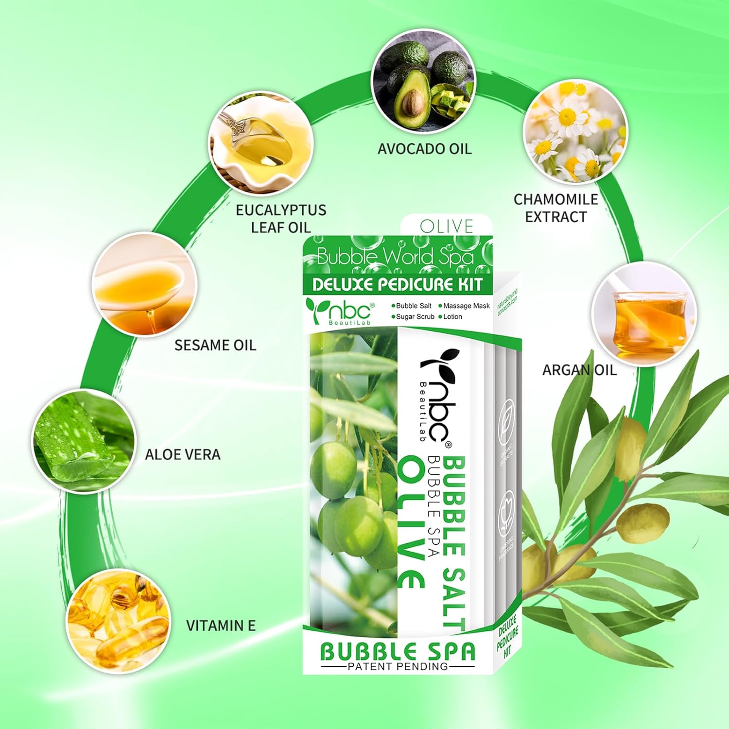 Pedicure Kit Foot Soak Set: Bubble Salt, Sugar Scrub, Massage Mask, Massage Lotion in a Box, 4 Step Foot Spa Kit for Dry Feet,Tired Feet (1 Set Olive)