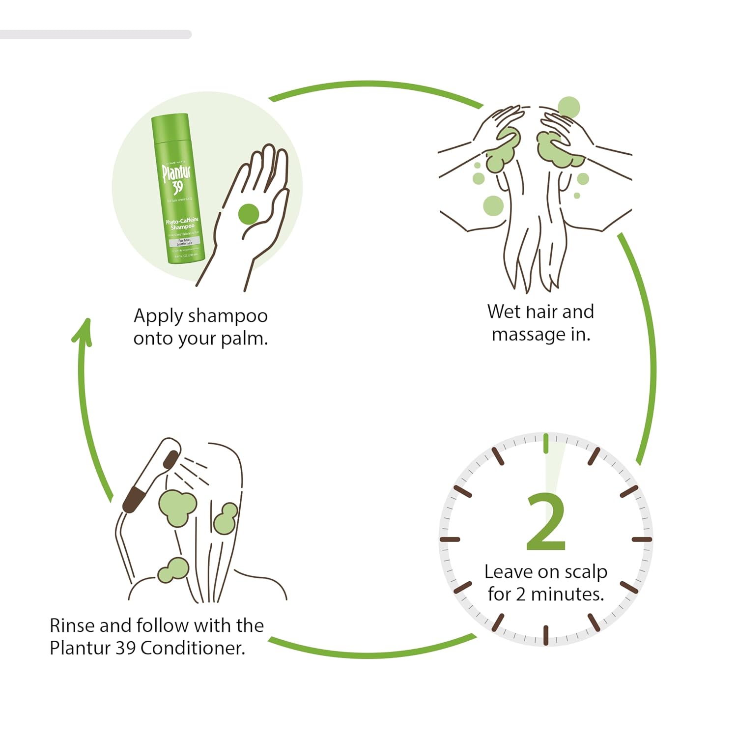 - USE DAILY: for optimum results. Leave on the scalp for 2 minutes from application to rinse. If your hair requires less washing, use our Plantur 39 Phyto-Caffeine Scalp Tonic in between shampoos. For best results, use with Plantur 39 Phyto-Caffeine Scalp Tonic containing castor oil