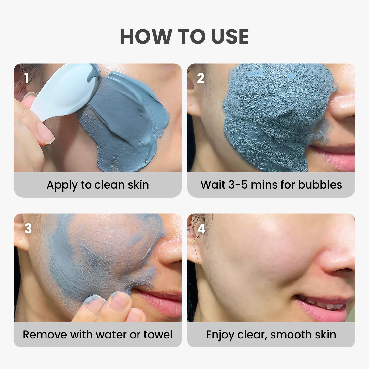 - HOW TO USE: Apply a thin layer on clean skin. Leave the mask on for 3~5 mins until bubbling. Gently massage and wipe it clean with warm water when bubbles form.