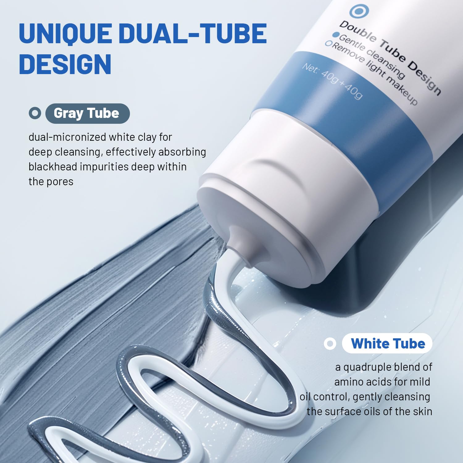 - UNIQUE DUAL-TUBE DESIGN: Our clay mask features an innovative dual-tube design that seamlessly combines two essential functions: gentle cleansing and deep cleansing. The gray tube contains dual micro-level white clay that penetrates deep into pores to effectively absorb and eliminate blackheads and impurities. Meanwhile, the white tube contains a quadruple amino acid formula that gently removes excess oil and cleanses the skin's surface, providing dual protection for your skin.