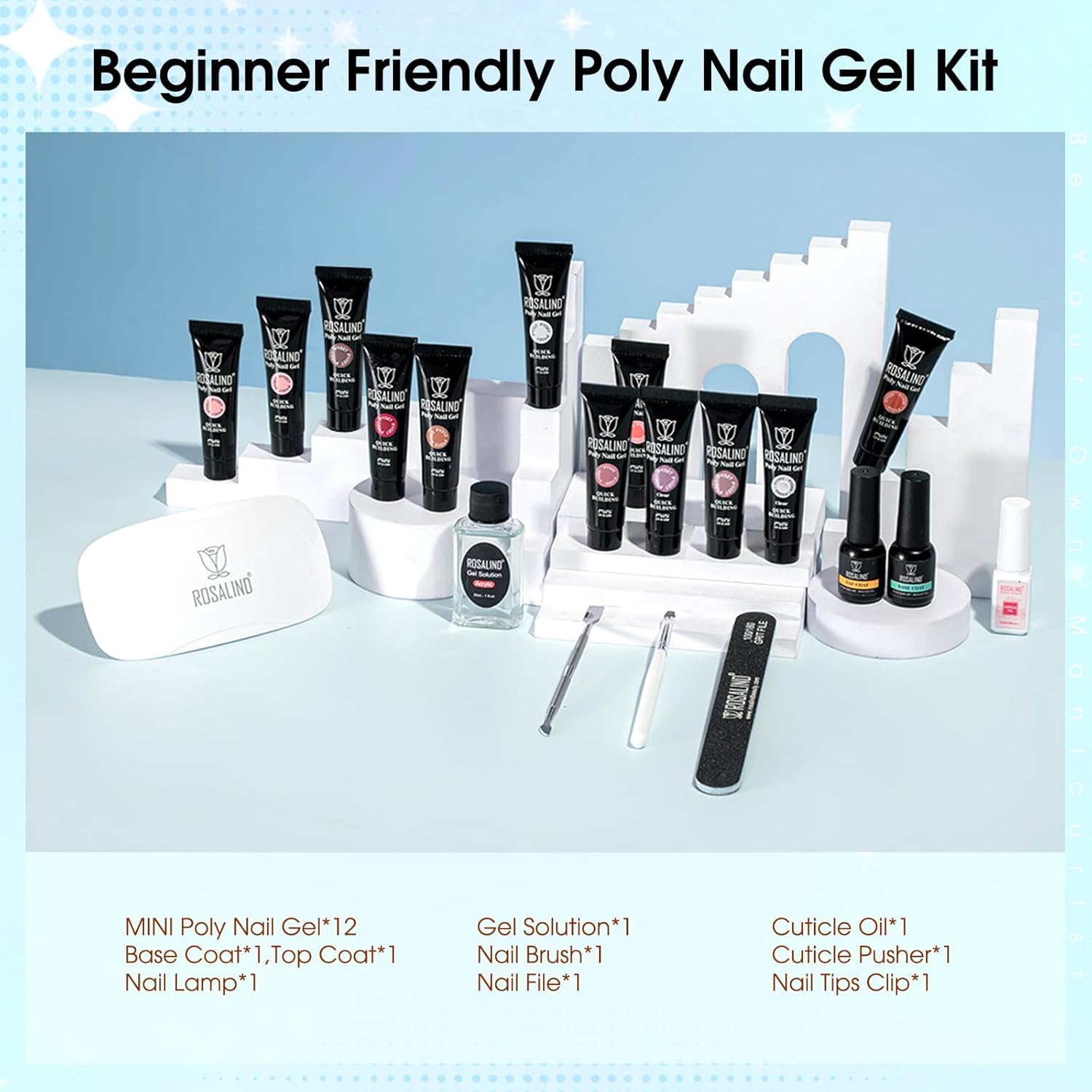 ROSALIND Pink Poly Nail Gel Kit -12 Colors + Nail Art Accessories Kit Poly Nails Gel Starter Kit with Slip Solution All Seasons Classic Colors Nails Extensions Set with Mini UV Lamp