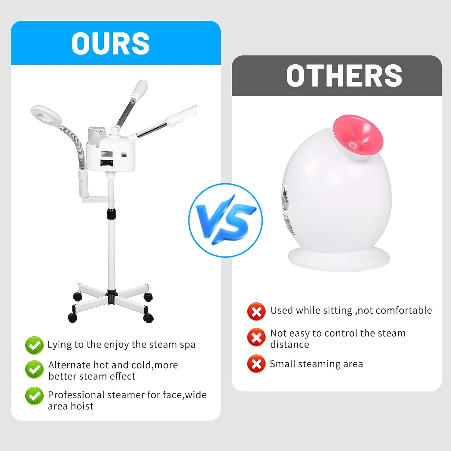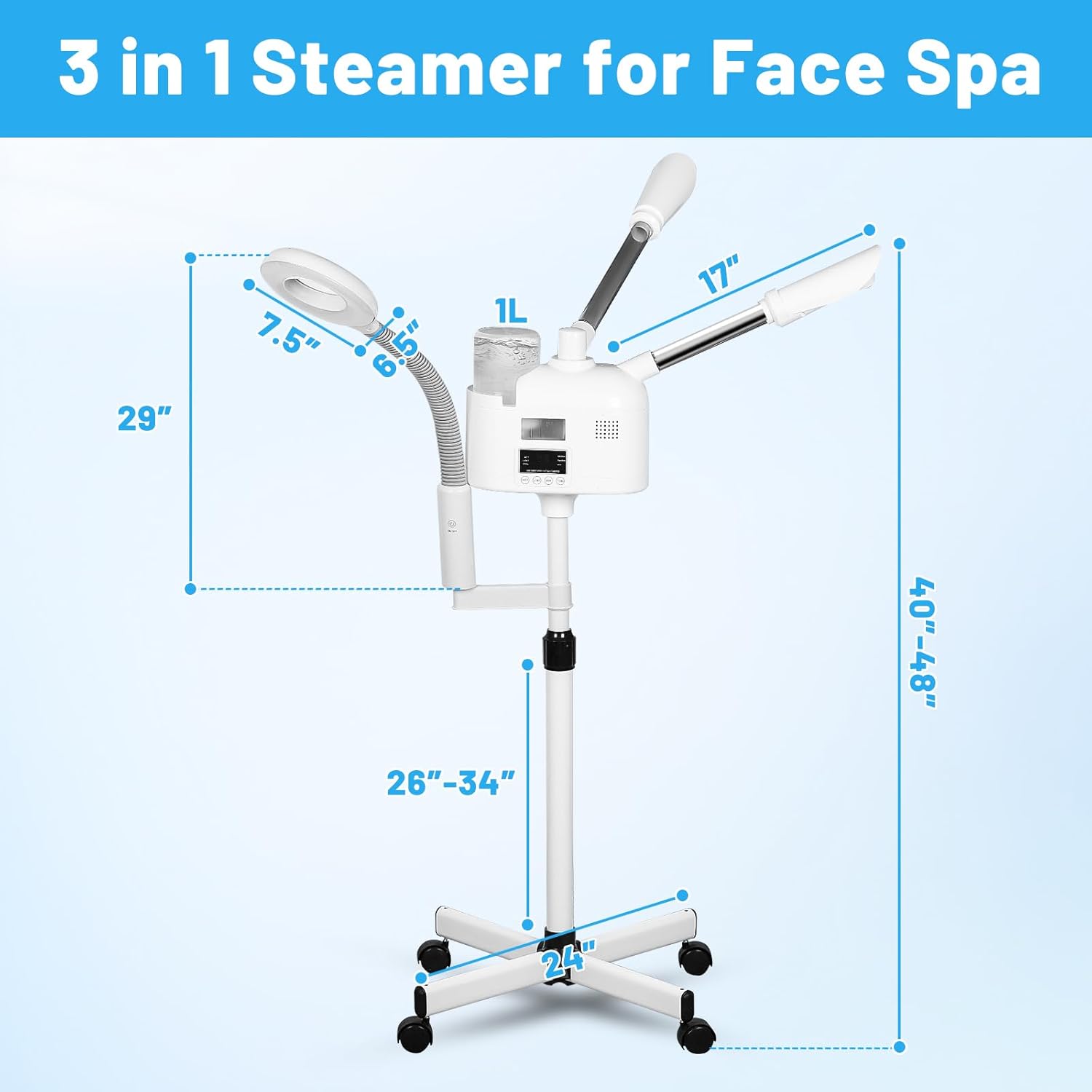 - GREAT QUALITY - Steamer for face spa on wheels,high quality warm stainless steel pipe, sturdy and durable, high capacity water cup, can store 1000ml water, the steamer generates the mist quickly with 1-3mins,the head of the machine is free to rotate 360ยฐ. Adjustable height from 38.1" - 48"