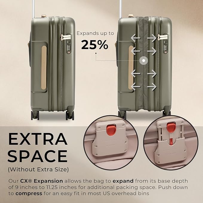 - DOMESTIC CARRY-ON LUGGAGE - Measuring 22" x 14" x 9-11.25", this packing system expands by 25% to become astonishingly roomy, then compresses to easily fit most US overhead bins