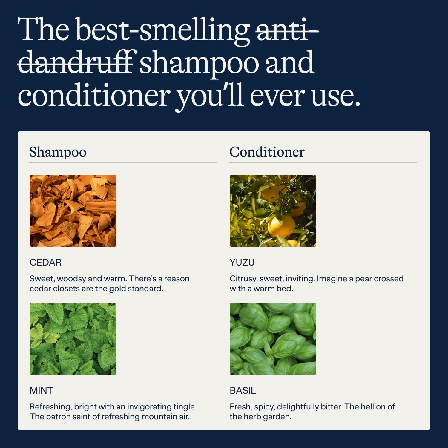 - Smells like a Forest, Not a Locker Room: Meet the best-smelling anti-dandruff shampoo and conditioner for men. Synthetic fragrances can irritate the scalp. We took the time to create 100% natural fragrances to give you the best experience possible Enjoy our shampooโs sweet, woodsy, and warm cedar scent and our conditionerโs refreshing yuzu and basil smell. Be the best-smelling man in the room.