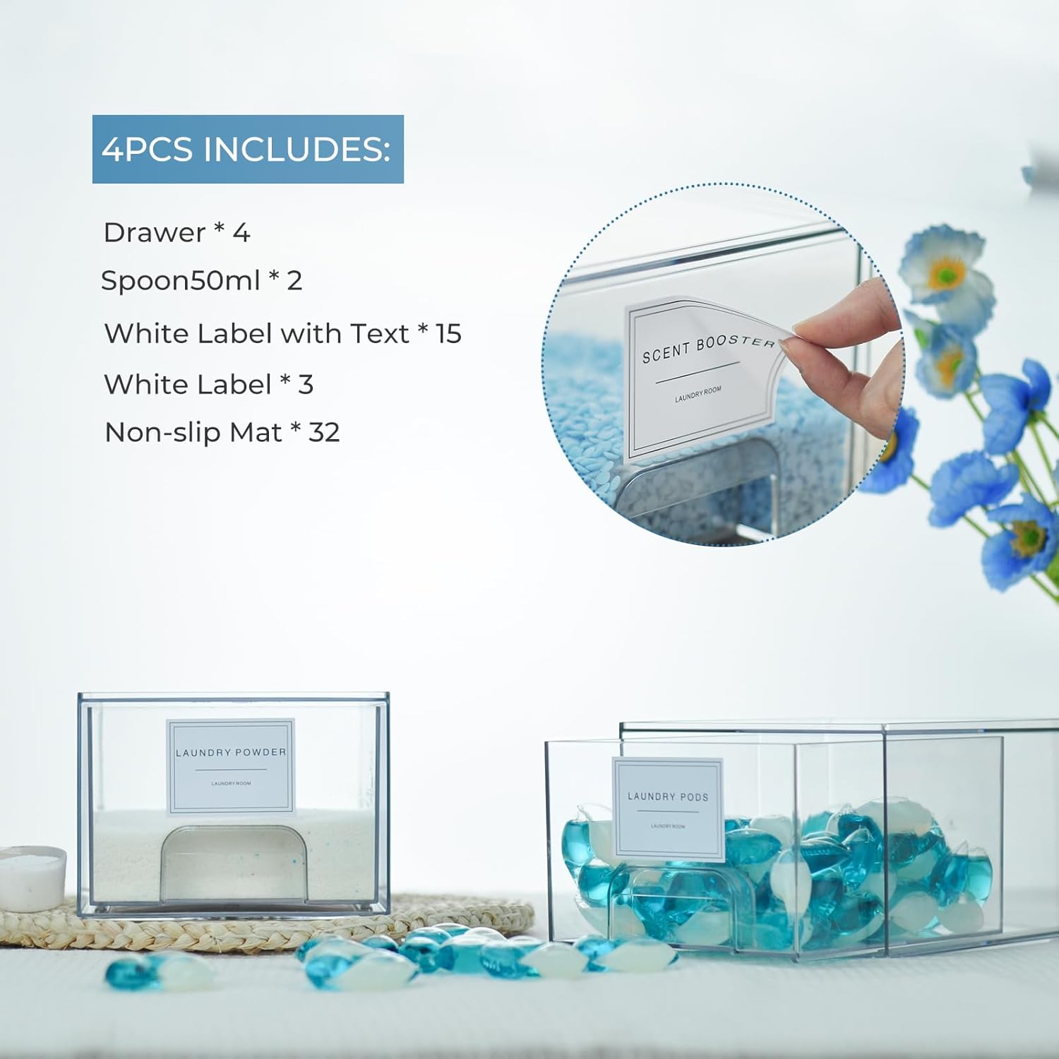 - Labels Included: To further enhance organization, our set of 4 pack laundry containers for organizing includes 18 labels . You can easily label each drawer according to its contents, making it even easier to find what you need. Stay organized and save time with our convenient labeling system. It's also includes 2 scoop specifically designed for measuring out laundry products accurately