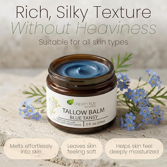 Aspen Kay Naturals Handmade 100% Grass Fed Beef Tallow Balm for Skin Care, With Organic Jojoba Oil + Chamomile (Blue Tansy) Organic Body Butter - 2 fl. oz. Made in USA