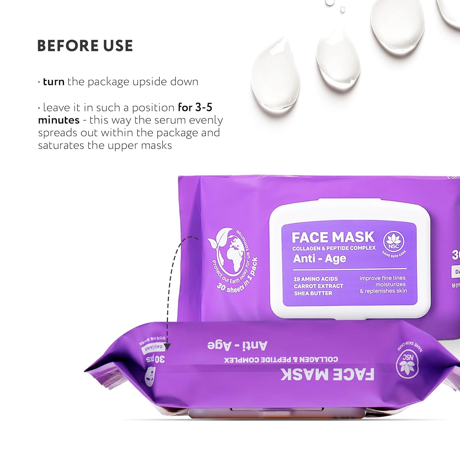 Korean Collagen Face Mask Set - 30-Pack Premium Sheet Masks with Peptide Complex - Advanced K-Beauty Skincare System - Complete Monthly Supply for Daily Care - Intensive Hydrating Facial Facemasks