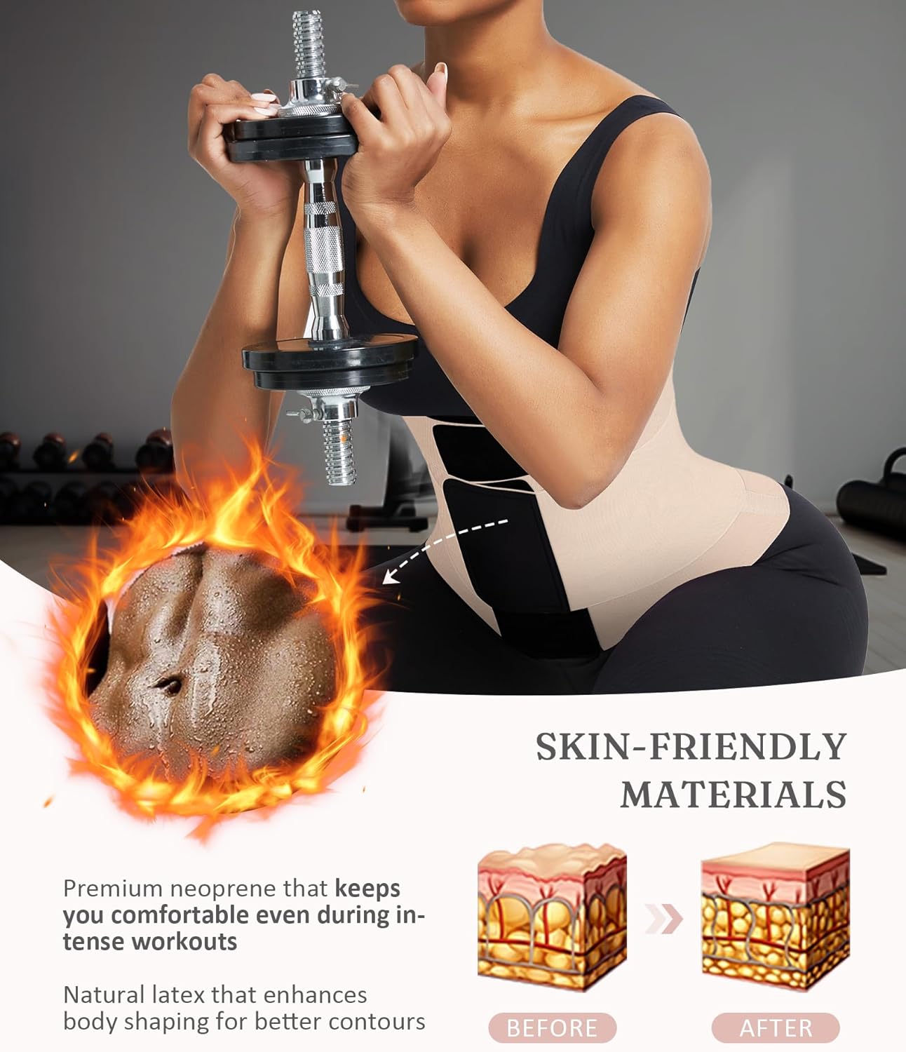 - Premium Stretch Fabric: Our waist trainer crafted from a blend of polyamide and spandex for targeted support and comfortable compression. The breathable material promotes natural heat retention during activity. Attention:Contains Latex Fiber. May cause allergic reactions in sensitive individuals. If you are allergic to latex or if you are not sure about this, please consult to your doctor for instructions before usage.
