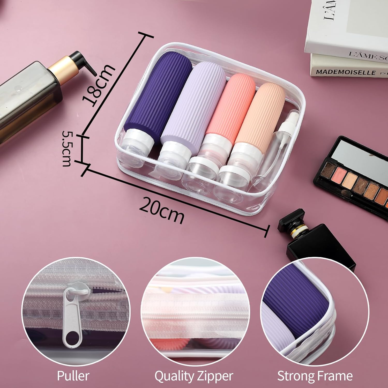 - Useful Travel Accessories: This is a oversize assortment of travel containers in a useful zip case. ( Come in 2 pcs Larege 6oz & 2pcs 3oz Travel Bottles + 4 Travel Jar s+ 2 Spray Bottles + 2 Scoopers + 1 Funnel + 1 Clean Brush + 1 Page Label + 1 Clear Toiletry Bag ) Multiple ones allow you take along different beauty products and toiletries according to your requirement