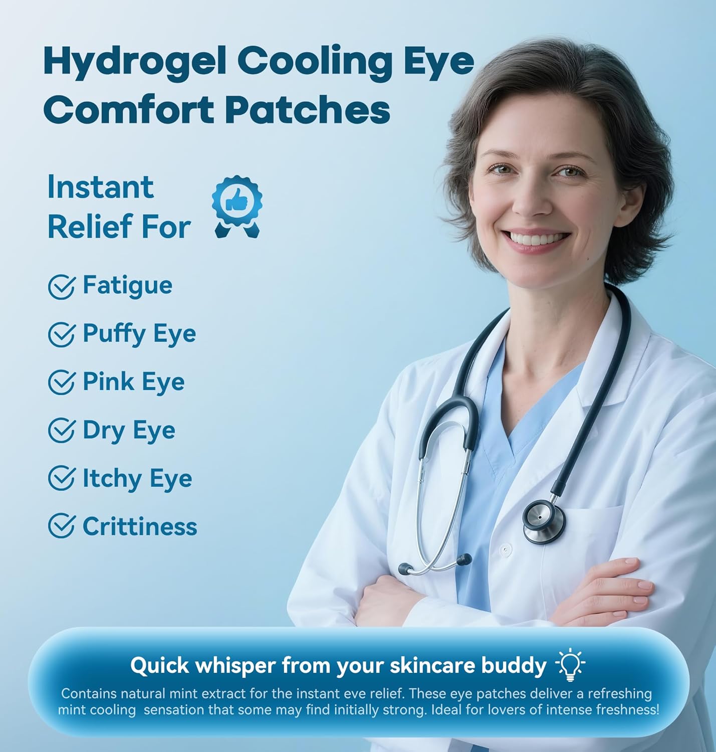 - 👩⚕️Doctor Recommended for AllSkin: Developed with input from skincare professionals, our eye patches are gentle enough for even the most sensitive skin. Non-irritating, hypoallergenic, and free from harsh chemicals.【💡Caution: Contains natural mint extract for fast-cooling relief. Do not apply to broken skin, cuts, or open wounds, as it may cause irritation or stinging.】