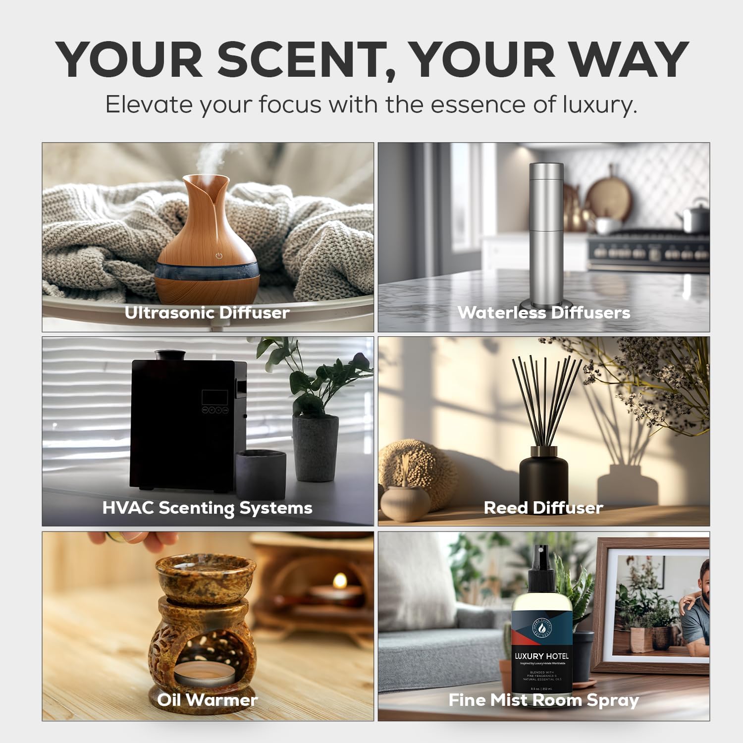 - Luxury Hotel Scent Diffuser Oil – Inspired by the iconic hotel fragrance, Luxury Hotel opens with ozone and lemon rind, blooms with gardenia, jasmine, and water lily, and finishes with amber and sheer musk for a refined, five-star aroma.